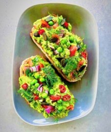 - Brot toasten und mit Erbsen-Guacamole bestreichen.