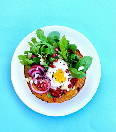 - Gebackene Kürbishälften auf Teller setzen. Mit Salat, Zwiebeln und Joghurt anrichten. Kreuzkümmel, Sesam und Pfeffer mischen. Kürbishälften mit Gewürzmischung und Mandelblättchen bestreuen. Mit Leinöl und dem aufgefangen Essig beträufeln. Nach Belieben mit Granatapfelkernen dekorieren.